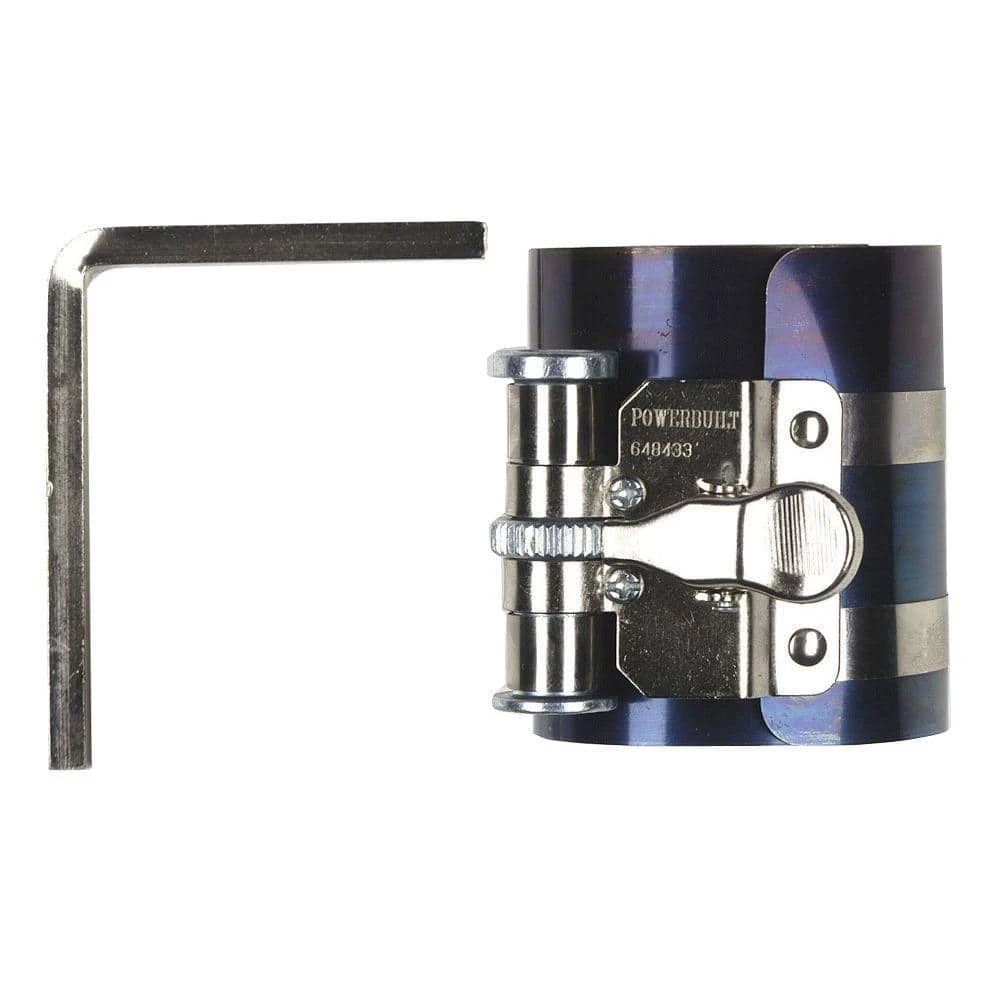 Handy tool makes it easy to compress the rings on pistons 2 to 5 in. diameter during piston installation. For added security, the compressing tool locks around the rings and piston units you release it. Nubs on the bottom of the tool help prevent it from sliding into the cylinder.