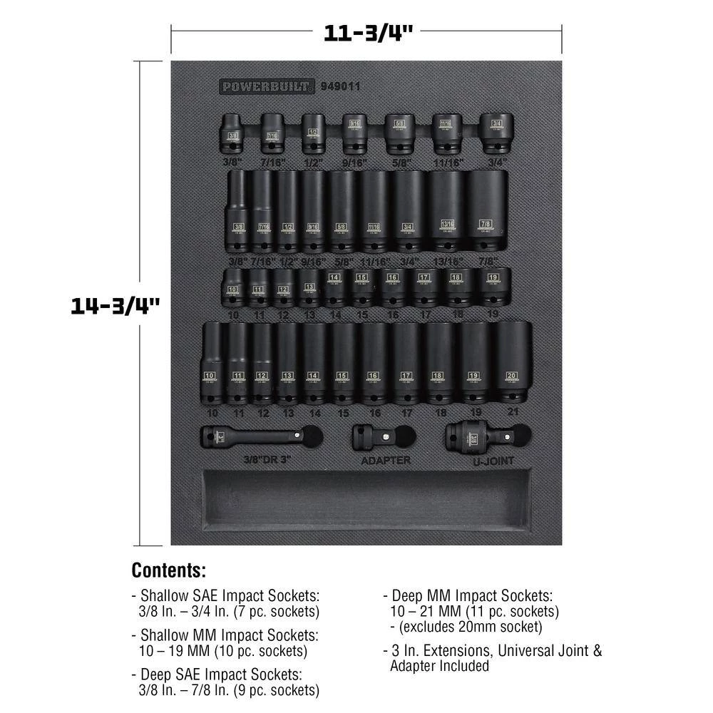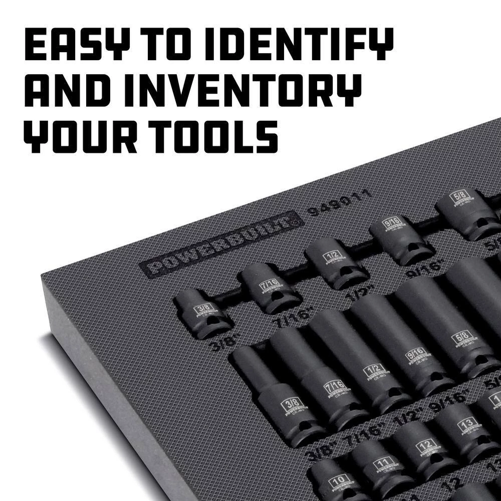 Powerbuilt Impact Sockets and accessories feature an industrial grade Black Phosphate finish that prevents corrosion and extends the life of the tool. Each socket is made from impact-rated Chrome Molybdenum Steel material for added durability with laser-engraved size marking that won’t rust or wear off – ever. Precision chamfered hex faces make it easier to guide onto fasteners and the exclusive Z-Drive 6 point hex pattern grabs and turns the flat surfaces of those fasteners to reduce round-off and slipping. Finally, socket center holes are punched through to add a bit more clearance for taller nuts and bolts. Powerbuilt impact socket and accessories offer the look, feel and performance hard-working Techs deserve and exceed ANSI standards for performance and quality.