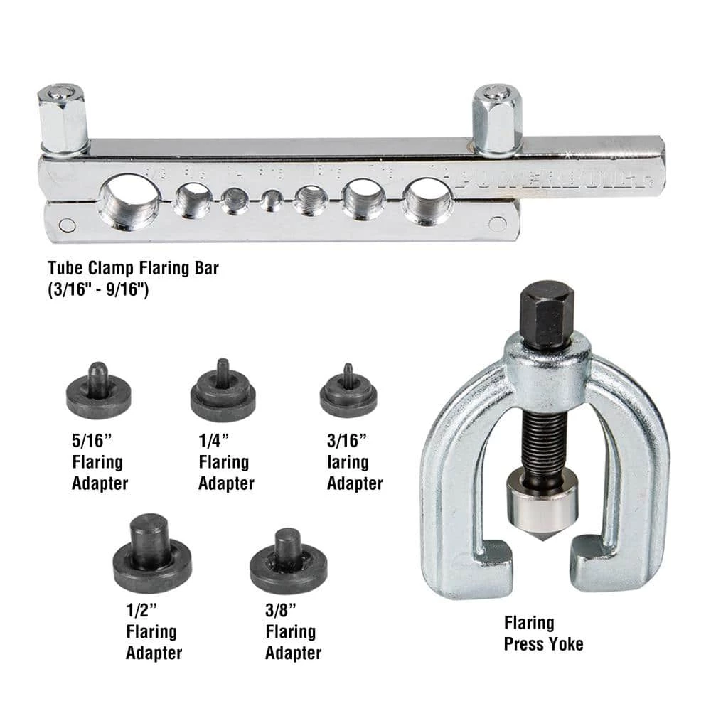 - CONTENTS: 1pc – flaring bar, 1pc – yoke, 5 pc Double Flare Dies for Tubing Sizes: 3/16 inch, 1/4 inch, 5/16 inch, 3/8 inch, and 1/2 inch flaring bar