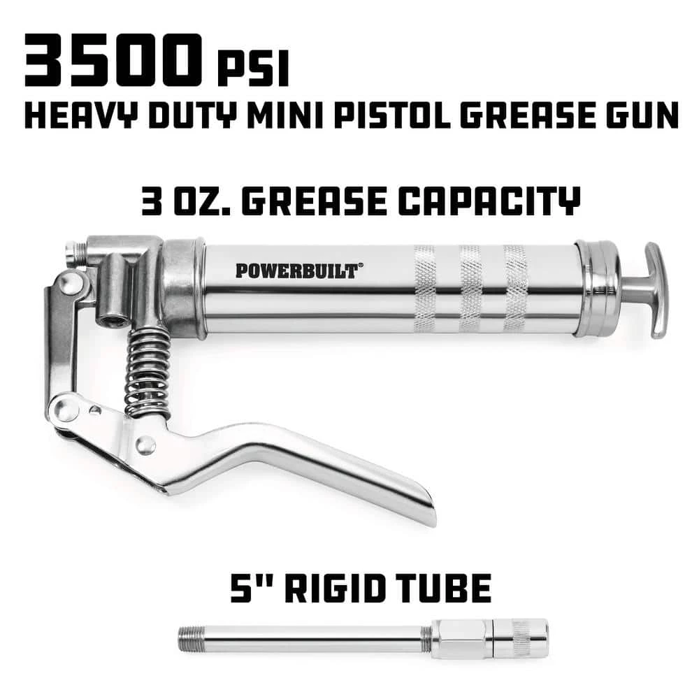 Lubrication is the key to a long trouble-free life for any moving metal parts. Use the Powerbuilt Mini Pistol Grip Grease Gun to precisely apply lubrication to your vehicle or other machinery. This 3000 PSI mini grease gun features a pistol grip for convenient one-handed operation and is forged from heavy-duty steel. It uses standard 3 ounce grease cartridges or it can be easily hand-packed for bulk filling. This tool comes with a 6″ extension pipe attaches at 0 degrees or 90 degrees to fit into hard-to-reach locations. Designed with a push-button air bleeder valve to prevent airlock.