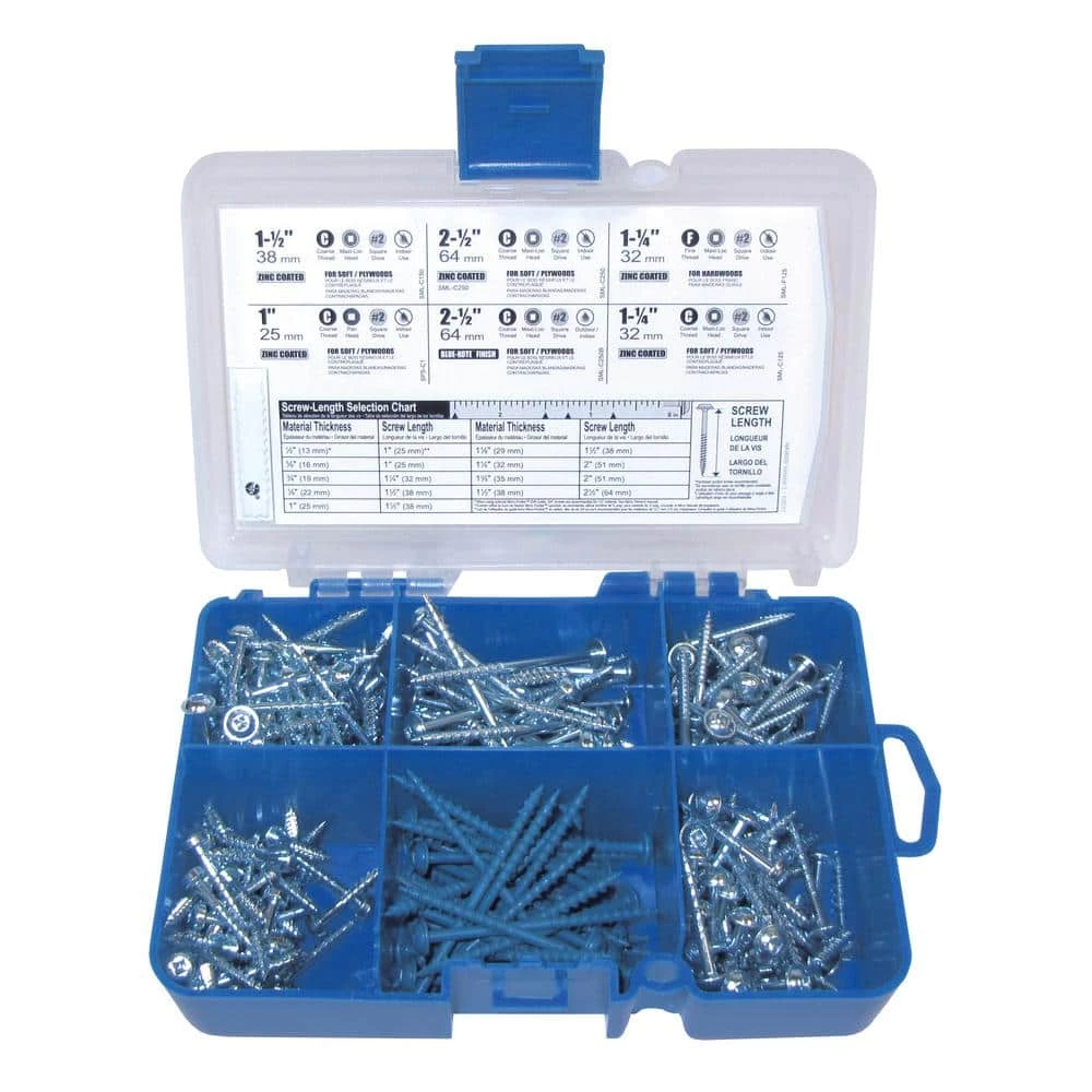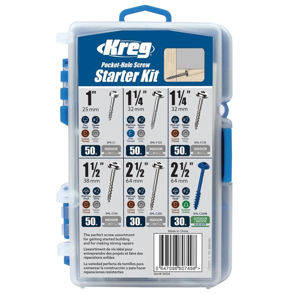 The Kreg pocket-hole screw starter kit provides a right-sized, right-priced assortment of the Kreg screws for Kreg joinery projects. The Pocket-Hole Screw Starter kit contains 260 Kreg screws in 6-popular sizes, making it a perfect choice if you are buying your first Kreg jig and just getting started building or if you are looking for an assortment that’s perfect for household repairs. The pocket-hole screw starter kit includes the most-commonly used Kreg screws, from 1 in. pan-head screws for building with 1/2 in. thick material, through 2-1/2 in. blue-kote screws for building bigger projects outdoors. All these screws are housed in a durable, divided case.