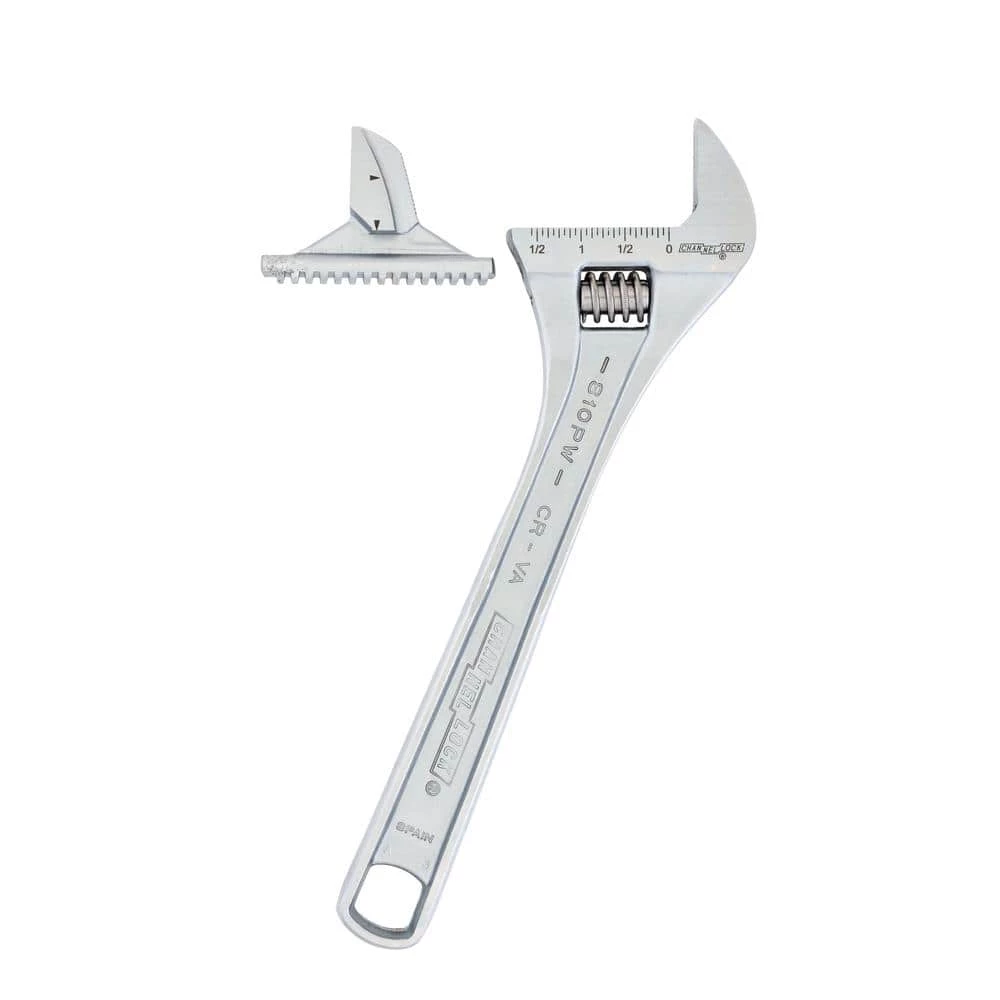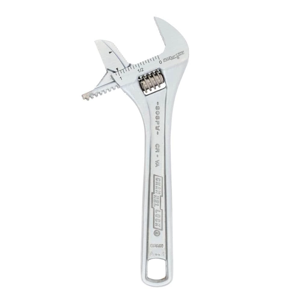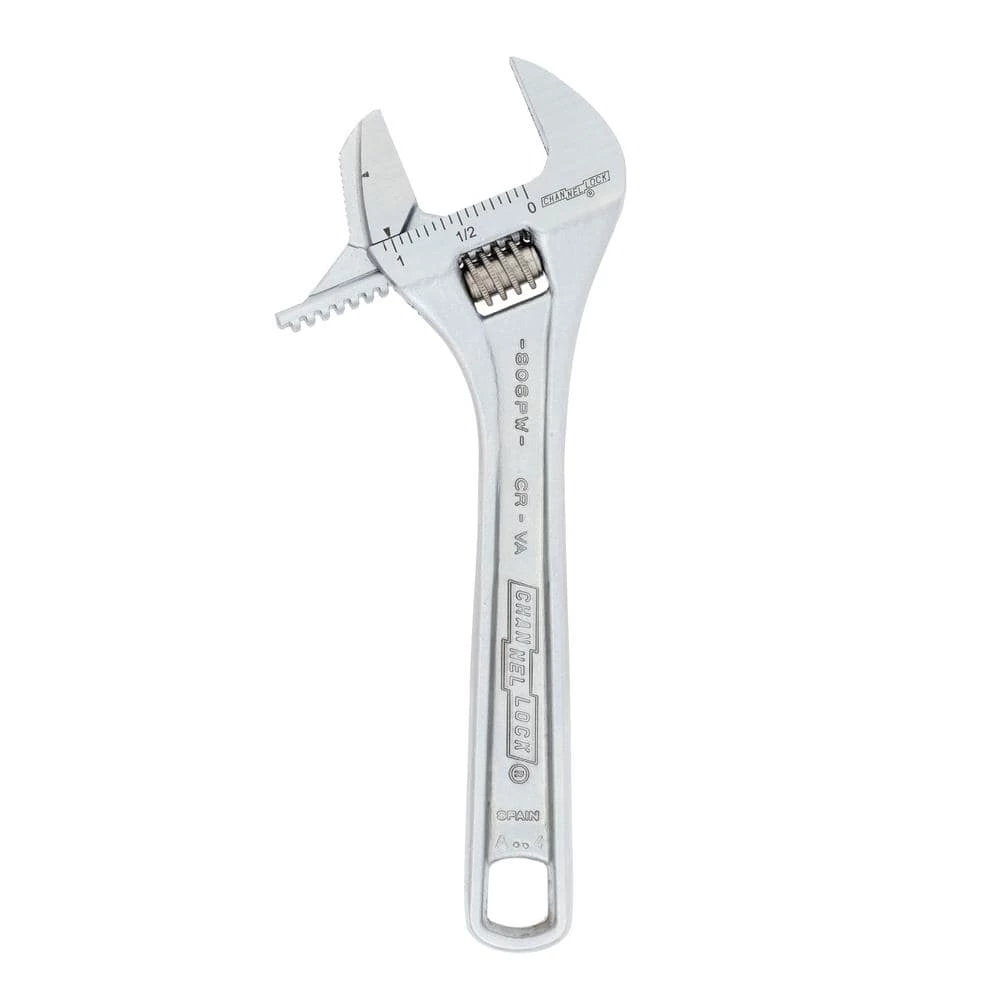 The Channellock 806PW reversible jaw adjustable wrench features an additional pipe wrench jaw option making these strong and reliable wrenches more versatile than ever. The reversible jaw makes simple work on bolts and fasteners as well as on round stock. The self-gripping angled teeth design grip pipe and rounded fasteners tight the first time, every time. With a 4 thread knurl and non-protruding jaws, the 806PW provides greater capacity while improving performance in confined spaces with its minimal head width. Constructed with chrome vanadium steel for durability.